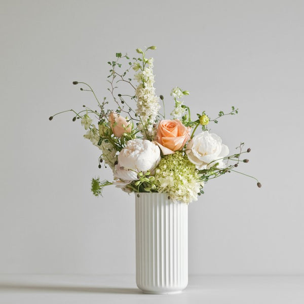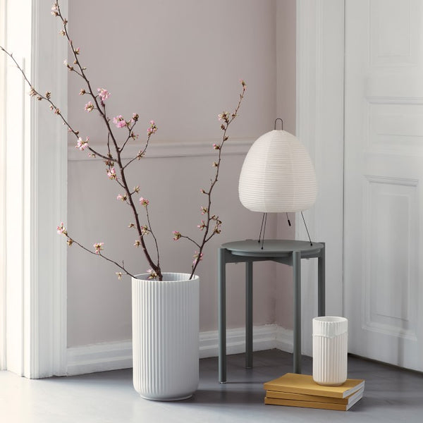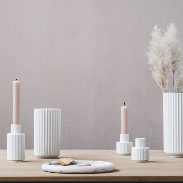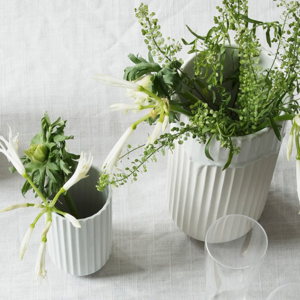 Inspired by a pattern from a mid-century collection found in the archives of the beloved Danish porcelain maker Navri, this collection features classic lines and a subtle geometric texture. Artisans craft these vases from porcelain with a glossy white glaze, striking the perfect balance of versatility and elegance.